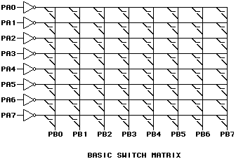 Remember that the way a closure in the matrix was detected was to take a Port A line low in the PPI (programmable peripheral interface), which is commonly called strobing, then look at a column bit on Port B. The intersecting contact is closed if the Port B bit is pulled low. Let's consider a couple of closures. Let's say we take PA2 on Port A low. Port B will show 0xFF if there are no closures since all of its bits will be pulled high by the resistors in ARRAY1 (see the schematic). Let's say that a switch at the intersection of PA2 and PB4 is turned on. Since PA2 is low, it will pull PB4 low through the closure, indicating the switch is on.
