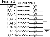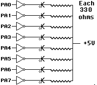 The routine can be tested with one of the above LED circuits as an output and the following test program after experi4c and digital are compiled and linked. The LED that is connected to Port A should turn on when the corresponding Port B line is taken low: