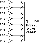 The diodes used in the matrix discussed earlier could become reverse biased and not conduct. That is true up to a point. In the real world they will conduct if their breakdown voltage is reached. The zener diode, designated by the bend in the line at the top of the arrow, exhibits a predictable breakdown voltage. It's 2.7V in this case. At and above 2.7V, it will always exhibit a constant drop of about 2.7V plus or minus its percent of tolerance. Since the power supply is providing 5V, with the .5V collector voltage of the 74LS05 added, the LEDs get about 1.8V, which is close enough to the specified 2V. The beauty of it is that you only need one zener for all eight LEDs. I have also tested the 1N4728 3.3V zeners. They work in the circuit and are easier to find.