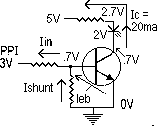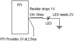 It will work, but it won't produce the maximum brightness out of the LEDs. Recall from above that the LEDs are rated at 20ma and 2V. That's typical. I used the Radio Shack #276-1622 variety pack and neither the voltage nor the current are specified. 20ma and 2V will be used for this discussion since they are typical values. The PPI will provide only 2.5ma, although it does give us at least 3V at that current. Mine actually provided closer to 4V. What we need is a way to increase the current. Turns out that's what a transistor does. It's a current amplifier. Its current gain is designated by its hfe parameter.