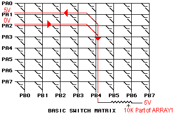 So far, so good, but notice what happens if the switch at the juction of PA1 and PB4 is also turned on. Remember that the matrix is strobed by taking only one bit of Port A low at a time. That means that all of the other bits on Port A are high, so PA1 will be high. A circuit will be made through the two switches that will connect PA1 and PA2 to each other. Since one is high and the other low, they will "fight" each other, and might stress the device beyond its limits.